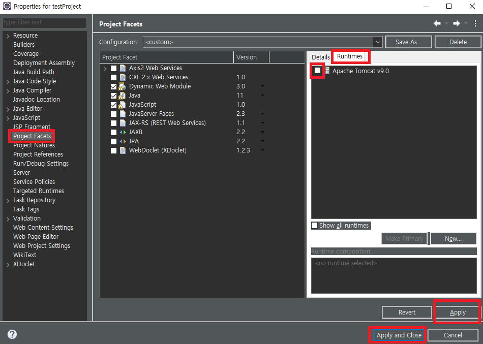 Runtime탭에 Apache Tomcat에 체크가 되어있지 않다면 체크후 Apply
