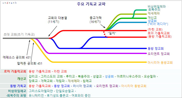 개신교:1517년서방교회개혁 찬성파로종교개혁을 기점으로 형성된 교파(루터교, 침례교, 성공회, 장로교, 감리교 등)를 총칭한다. 유럽에서는 '복음주의교회'라고 한다.