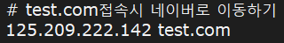 -hosts 파일을 수정하여 test.com접속시 naver.com로 이동하도록 해보자