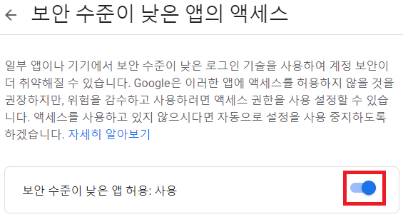 [보안수준이 낮은앱 허용]을 사용으로 변경해준다