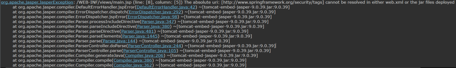 ✔ Solution 스프링 시큐리티 태그 디펜던시를 추가 <!-- Spring Security Tag --> <dependency> <groupId>org.springframework.security</groupId> <artifactId>spring-security-taglibs</artifactId> <version>본인의 스프링시큐리티 버전 작성</version> </dependency>