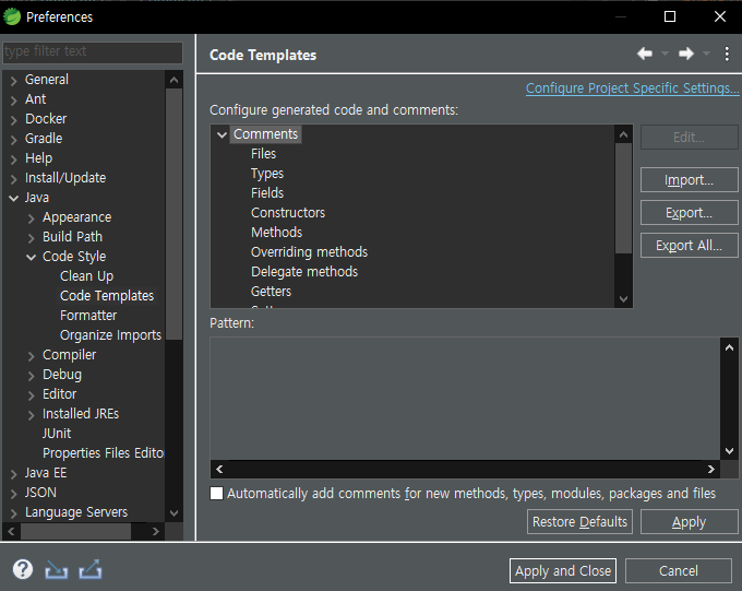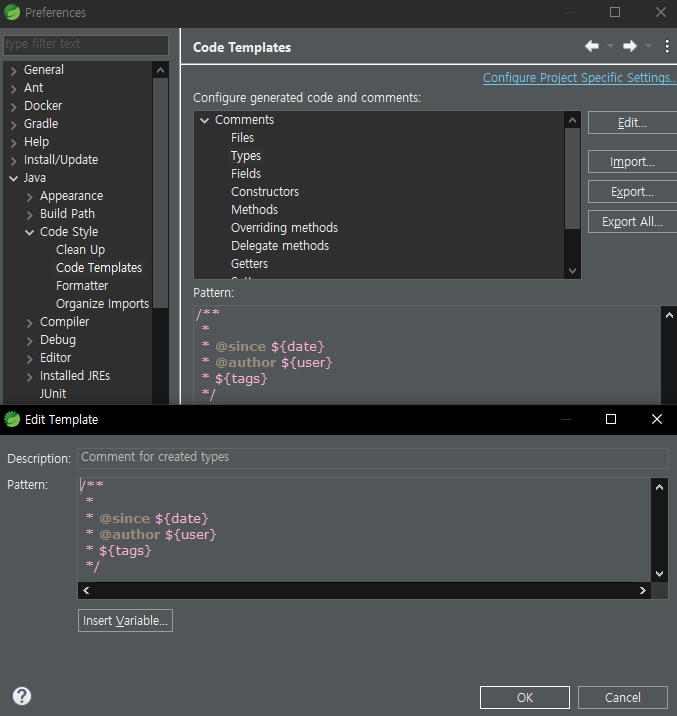 이클립스에는 자바독 형식의 주석을 필요에 따라 템플릿으로 저장해 불러올 수 있는 기능이 있다