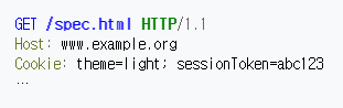 그 다음 브라우저는 웹사이트에서 spec.html를 방문하기 위해 다른 요청을 보낸다. 이 요청은 Cookie HTTP 헤더가 포함되어 있으며 이는 서버가 브라우저에 설정을 지시하는 2개의 쿠키를 담고 있다