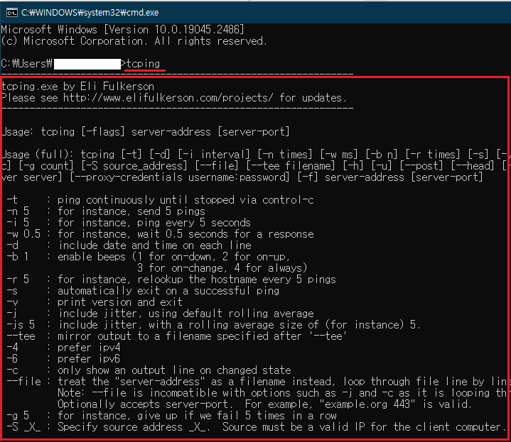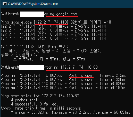 아래와 같이 나오면 tcping.exe 설정이 제대로 된 것이다
