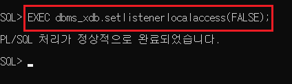 # 외부에서 오라클에 접속가능하도록 설정 EXEC dbms_xdb.setlistenerlocalaccess(FALSE);외부에서 오라클에 접속가능하도록 설정