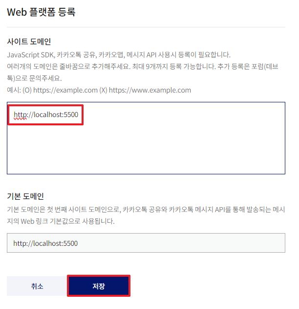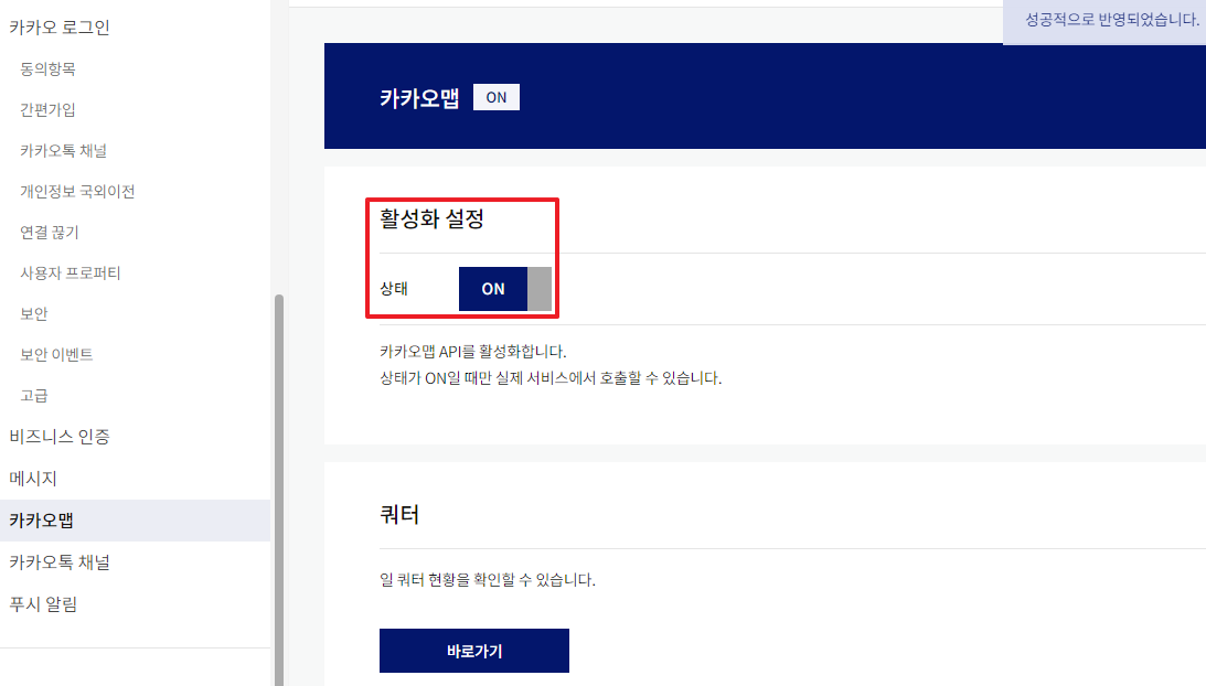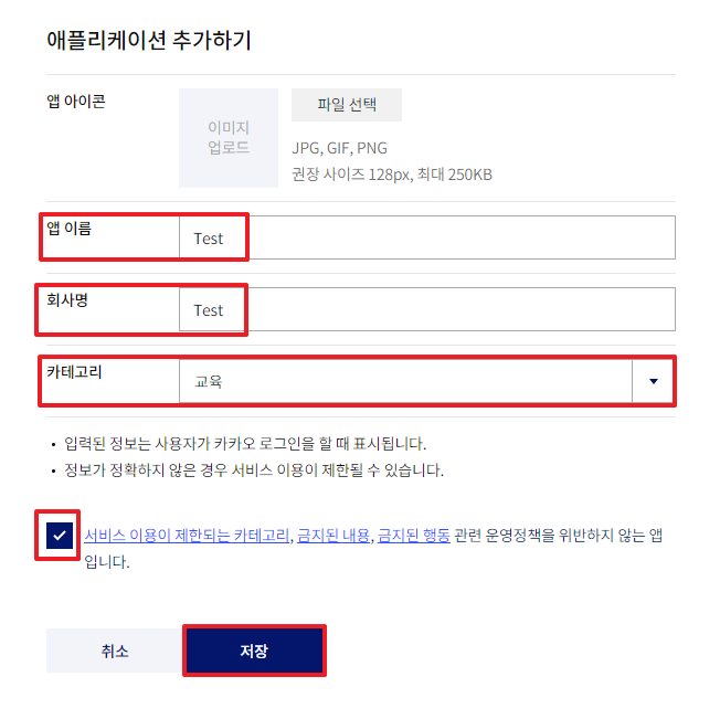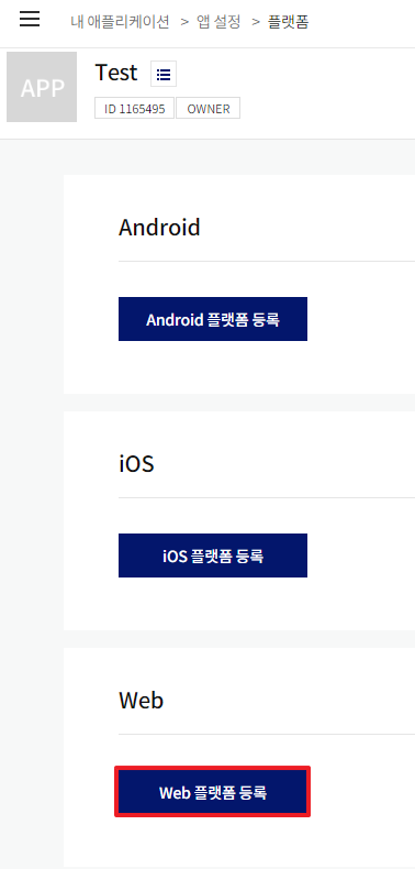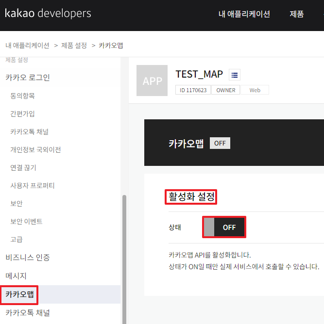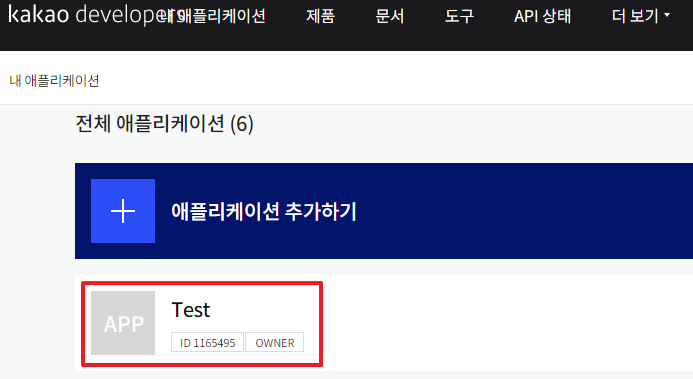 1.https://developers.kakao.com/에 접속해 로그인을 한다 2. 상단의 [내 어플리케이션] 메뉴를 누른다 3. 애플리케이션 추가하기 를 누른다 4. 앱이름, 회사명, 카테고리를 작성한다(test용이니까 아무렇게나 입력해도됨) 5. 방금 추가한 앱이 생성된것이 보인다. 눌러준다 6. 좌측 상단의 메뉴를 눌러준다 7. 플랫폼을 눌러준다 8. 본인이 API사용을 원하는 플랫폼을 선택한다 나는 웹에서 test할것이기때문에 Web플랫폼등록을 선택한다 9. 원하는 프로토콜,도메인,포트를 작성후 저장버튼을 눌러준다 10. 내 애플리케이션 > 제품 설정 > 카카오맵 메뉴로 이동해서 카카오맵 활성화 설정을 ON로 변경해준다활성화 버튼 클릭해준다카카오맵 활성화가 완료된 화면 11. 다시 좌측상단 메뉴를 눌러준다. API Key를 얻으러 가야한다. 12. 앱 키 를 눌러준다 13. 나는 html에서 js로 사용할것이기때문에 js키를 복사를 눌러준다 14. 발급받은 JS API key를 이용해 html에서 카카오맵 띄워보기 https://apis.map.kakao.com/web/guide/ 해당 페이지에 가면 잘설명이 되어있는데