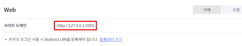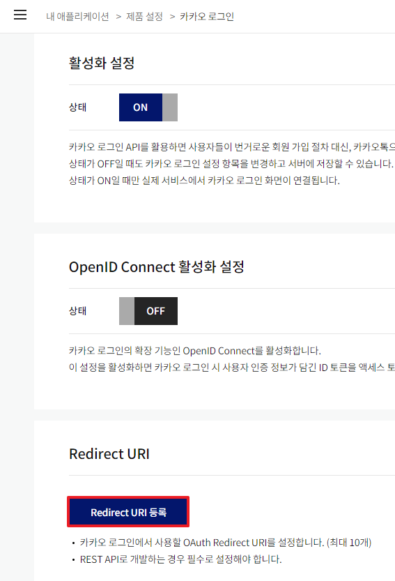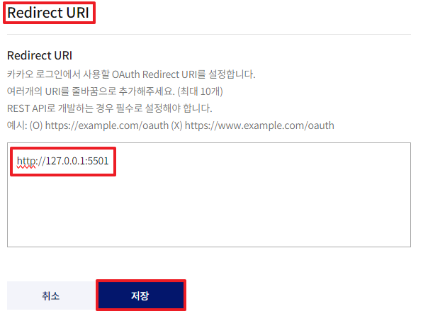 [ 1-2. Redirect URI 등록하기 ] 카카오 REST API 사용시 필요한 토큰을 받기위한 리다이렉트 주소를 등록해줘야한다 [카카오 로그인] 페이지의 하단에서 등록 가능하다