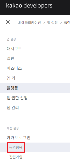 [앱메뉴]를 다시 눌러서 [플랫폼] 페이지로 이동한다 앱메뉴 클릭플랫폼 페이지로 이동하기 [플랫폼] 페이지에 접속하면 다음과 같은 화면이 보여지는데 나는 Web으로 REST API를 사용할거기때문에 Web플랫폼등록 버튼을 눌러준다 Web플랫폼등록 [Web플랫폼등록]화면이 보여지면 본인이 카카오톡 인가코드를 응답받을 리다이렉트 URL을 입력해준다 아래는 내가 응답받을 주소이다 카카오톡 로그인시 리다이렉트 될 URL 등록하기저장후 완료된 화면[ 1-4. 동의항목 선택하기 ] 리다이렉트 URL을 등록완료했으면 다시 [앱메뉴]를 눌러준다 [동의항목] 메뉴를 눌러준다 동의항목 페이지로 이동하기