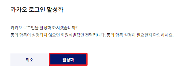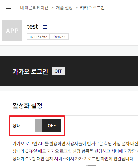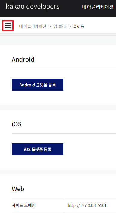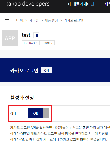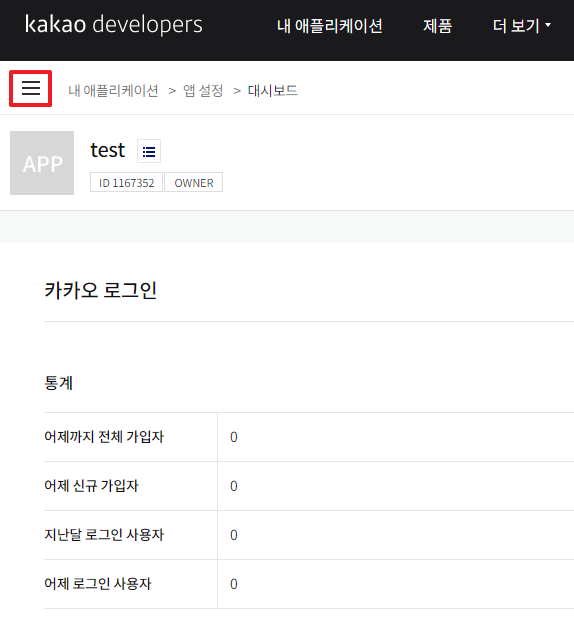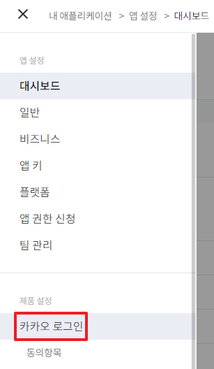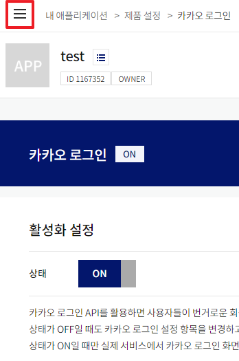 [ 내 애플리케이션 ]화면에서 생성된 앱을 눌러준다 생성된 앱을 눌러준다 그러면 [내 애플리케이션] > [앱 설정] > [대시보드] 화면으로 넘어오게되는데 좌측 상단의 메뉴버튼을 눌러준다 설명의 편의를 위해 앞으로 이 좌측상단 메뉴를 [앱메뉴] 라고 부르겠다 앱 대시보드 화면 메뉴가 보여지면 카카오 로그인 메뉴를 클릭해준다 카카오 로그인 메뉴 클릭하기 활성화 설정 상태가 OFF로 되어있는데 클릭해서 ON으로 변경해준다 OFF를 클릭해서 상태를 ON으로 변경해준다 클릭후 아래화면이 뜨는데 활성화 를 눌러준다 카카오 로그인 활성화 하기카카오 로그인 활성화 ON으로 변경 완료