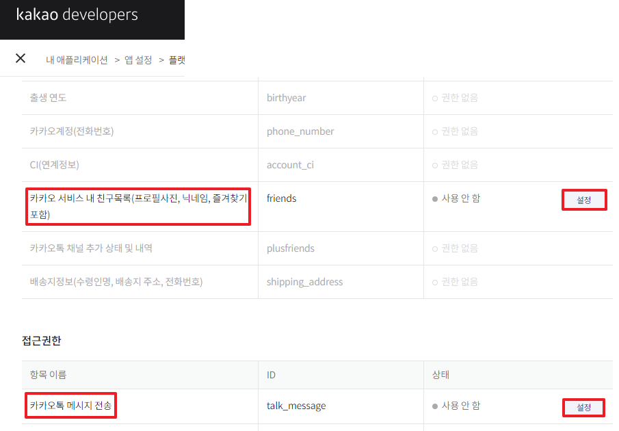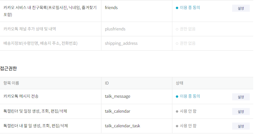 여기서 2가지의 설정을 기존값의 사용안함에서 -> "이용 중 동의" 로 변경해줘야 한다 1.카카오 서비스 내 친구목록 값 변경 2.카카오톡 메시지 전송 값 변경