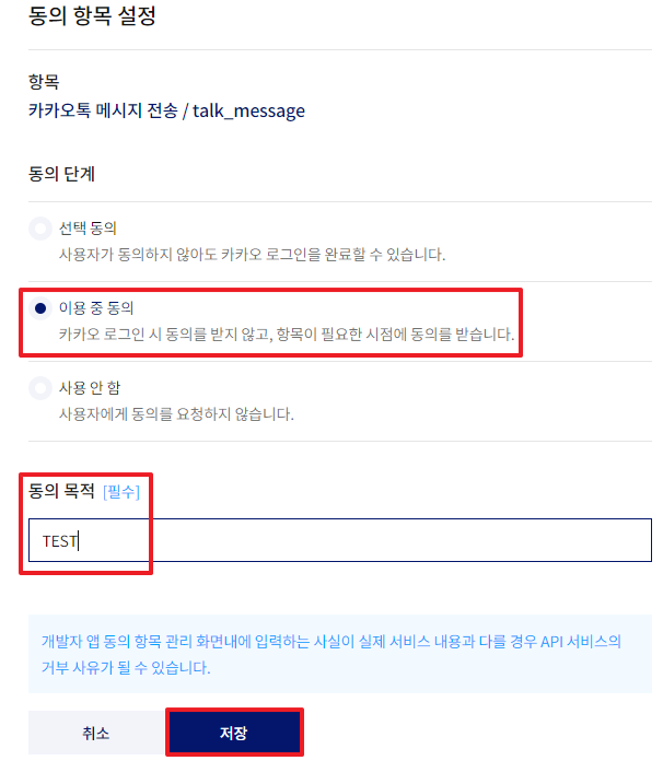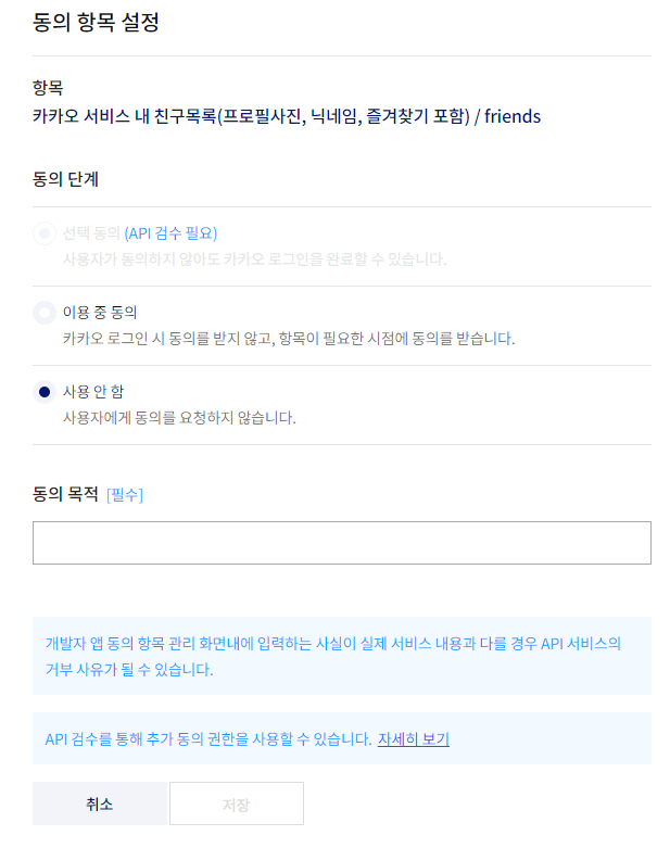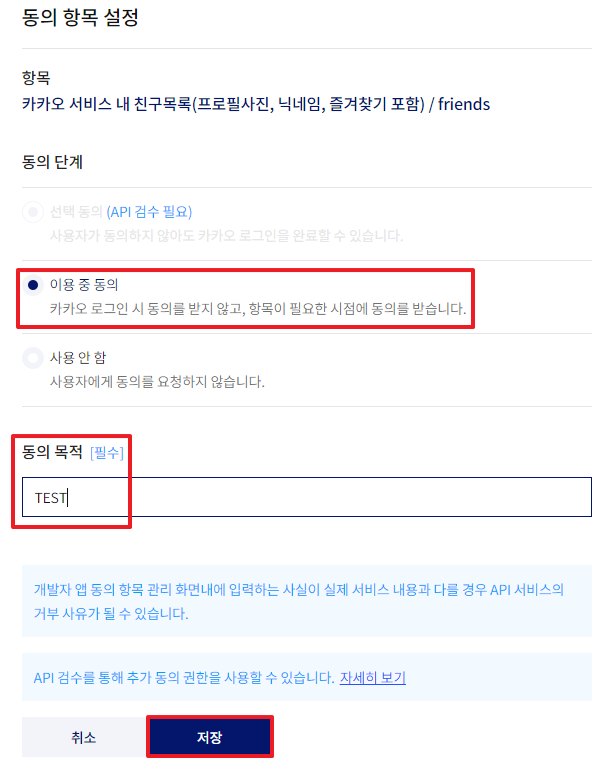 처음화면은 위와 같이 나올텐데 아래화면과 같이 변경하고 저장버튼을 눌러준다 동의단계 : 이용 중 동의 동의목적 : TEST(테스트므로 아무거나 입력) 카카오 서비스 내 친구목록 동의단계 변경후 저장하기