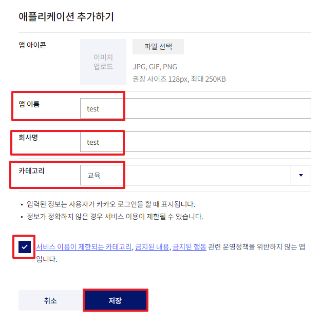 애플리케이션 추가하기 화면이 뜨면 -앱이름 -회사명 -카테고리 값을 입력해주고(test용으로 쓸거기때문에 대충입력) 체크박스에 체크한뒤 저장을 눌러준다 생성될 애플리케이션 정보 입력하기