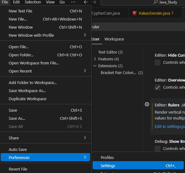 1. File > Preferences > Settings (단축키 : Ctrl + , )Settings 클릭