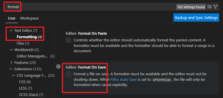 2. 검색창에 format입력후 Text Editor>Formatting에 들어가서 Format On Save기능 체크해제하기