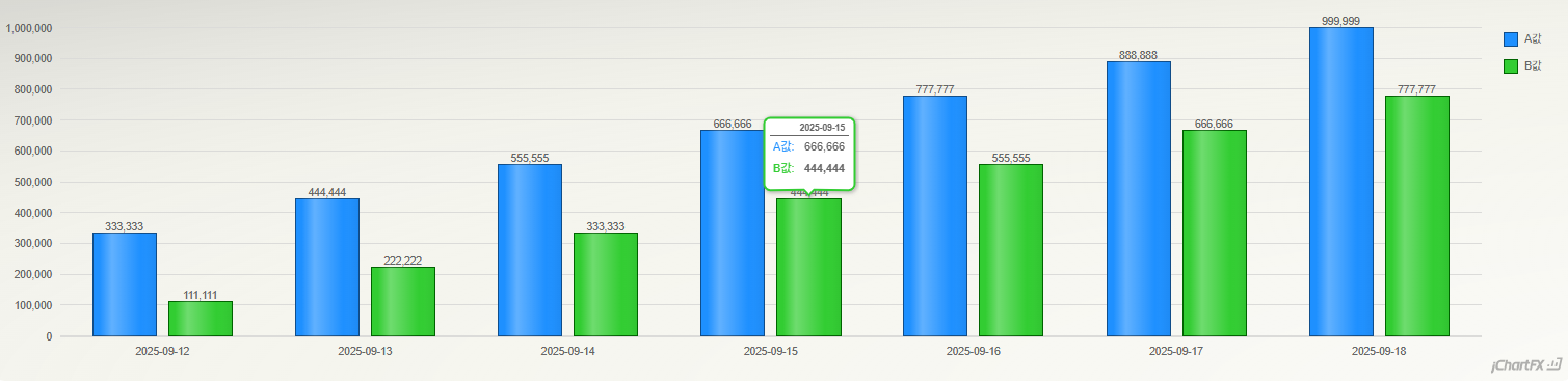 https://support.softwarefx.com/jChartFX/api(차트 라이브러리)기존 차트 // 더미 데이터 let data = [ { date: "20250912", A: 333333, B: 111111 }, { date: "20250913", A: 444444, B: 222222 }, { date: "20250914", A: 555555, B: 333333 }, { date: "20250915", A: 666666, B: 444444 }, { date: "20250916", A: 777777, B: 555555 }, { date: "20250917", A: 888888, B: 666666 }, { date: "20250918", A: 999999, B: 777777 }, ]