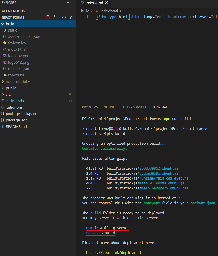 1. 배포할 프로젝트 경로에서 명령어를 통해 프로젝트 빌드를 해줌( build폴더가 생성됨 ) npm run build # npm을 통해 serve라는 웹서버를 설치하는 명령어 npm install -g serve # serve웹서버 실행시 DocumentRoot를 build 폴더로 지정하는 명령어 serve -s build 2. public폴더 밑의 index.html파일의 내용이 빌드되어 bulid폴더 밑의 index.html로 생성됨 3. 웹서버의 최상위 경로(Document Root)에 생성된 build폴더밑의 파일들을 넣어주면된다 4. npm serve를 이용해 배포후 테스트 -serve웹서버 실행시 DocumentRoot를 build폴더로 npx serve -s build