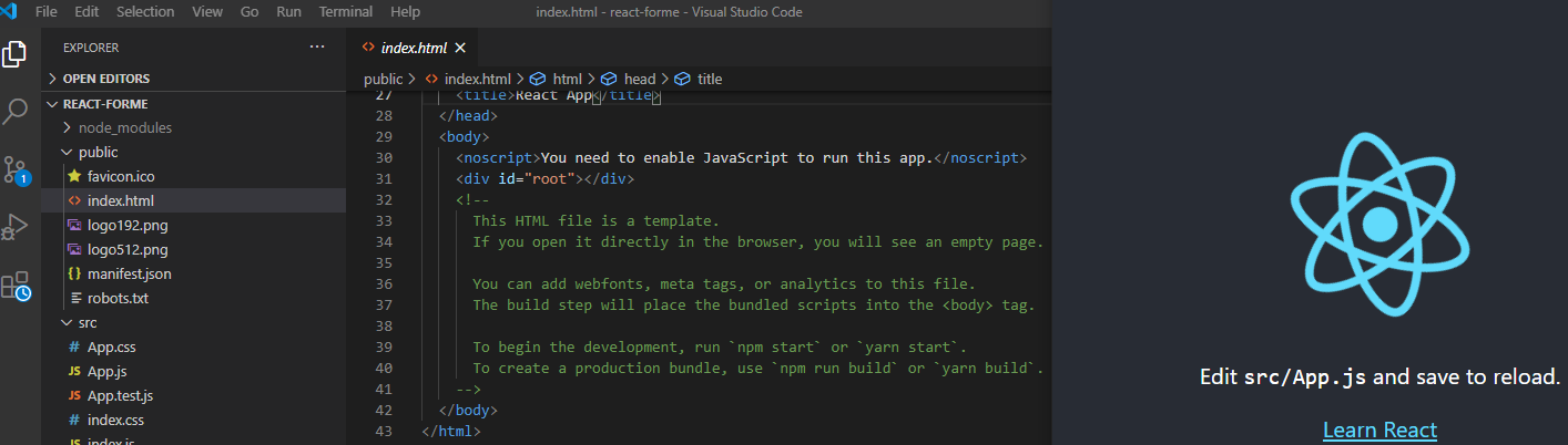 1. create-react-app 명령어로 react프로젝트 생성후 보여지는 첫화면은 index.html이다 2. index.html의 id가 root인 엘리먼트의 밑으로 컴포넌트들이 들어가게된다 이유는 index.js에 작성되어있다 3. 리액트의 진입파일은 index.js이고 id가 root인 엘리먼트에 렌더링 되도록 작성되어있다 4. App은 App.js를 뜻하며 리액트 컴포넌트이다 5. App.js 컴포넌트가 id가 root인 엘리먼트 밑으로 렌더링 된것을 확인할 수 있다 6. App.js 컴포넌트를 수정하여 내용이 변경되는것 확인