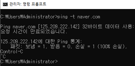 핑 테스트 하기 ping -t [테스트 주소]
