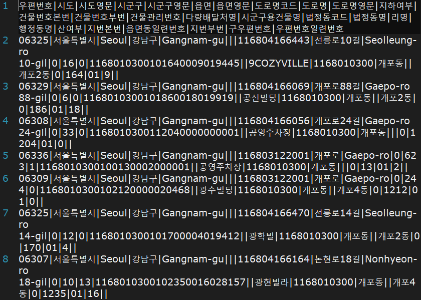 우편번호검색 - 우편번호 내려받기 www.epost.go.kr 작업이 필요한 텍스트 파일은 위 사이트에서 받을 수 있다 우편번호와 지역정보가 입력된 txt파일을 내려받을 수 있다 압축을 풀고 지역별txt 파일을 열어보면 아래와 같다 위 데이터를 작업하기 쉽도록 엑셀파일로 변환할것이다 1. 엑셀실행후 [파일]을 클릭한다 2. [열기] > [찾아보기] 3. 파일형식을 모든파일(*.*)로 선택한뒤 변환할 txt파일을 선택후 [열기] 클릭 4. 텍스트 마법사 1단계 - 원본데이터 형식을 체크후 [다음] 클릭 5. 텍스트 마법사 2단계 - 데이터의 구분기호를 설정 위 사진의 데이터 미리보기 영역은 구분기호 설정을 따로 하지 않았을때 원본데이터 형식의 모습이다 데이터들이 | 를 구분자로 분류되어있는것을 볼 수 있다..