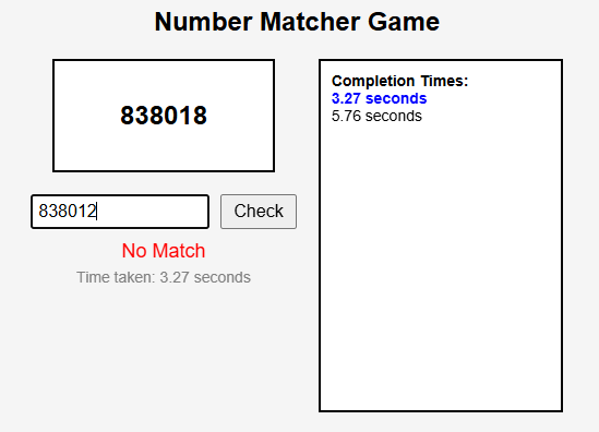 Number Matcher Game Number Matcher Game 000000 Check Completion Times: MyProjects/VanillaJS 2024.11.28