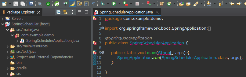 [Problem] 스프링부트 프로젝트 생성후 실행시 다음과 같이 클래스를 찾지 못하며 실행시 에러발생 console에는 오류: 기본 클래스 com.example.demo.SpringSchedulerApplication을(를) 찾거나 로드할 수 없습니다. 다음과 같은 알림창 노출됨 ✔ Solution 1. 해당 프로젝트 클릭후 Alt + Enter키를 누르면 해당 프로젝트의 Properties가 열리는데 Java Build Path > Libraries탭을 가보면 Classpath부분에 JRE System Libray가 X로 표시되고있다 이클립스의 JRE세팅이 잘못되어있는 것이다 2. 따라서 JRE를 다시 세팅해주면 된다 3. Alternate JRE 라디오버튼을 선택후 Installed JREs... 버..